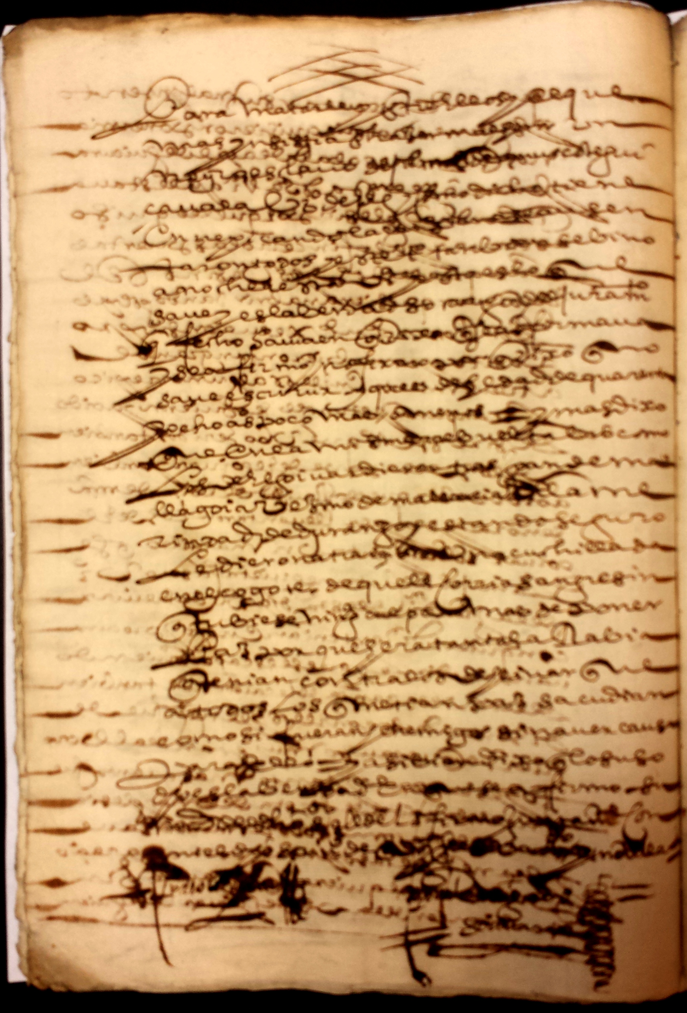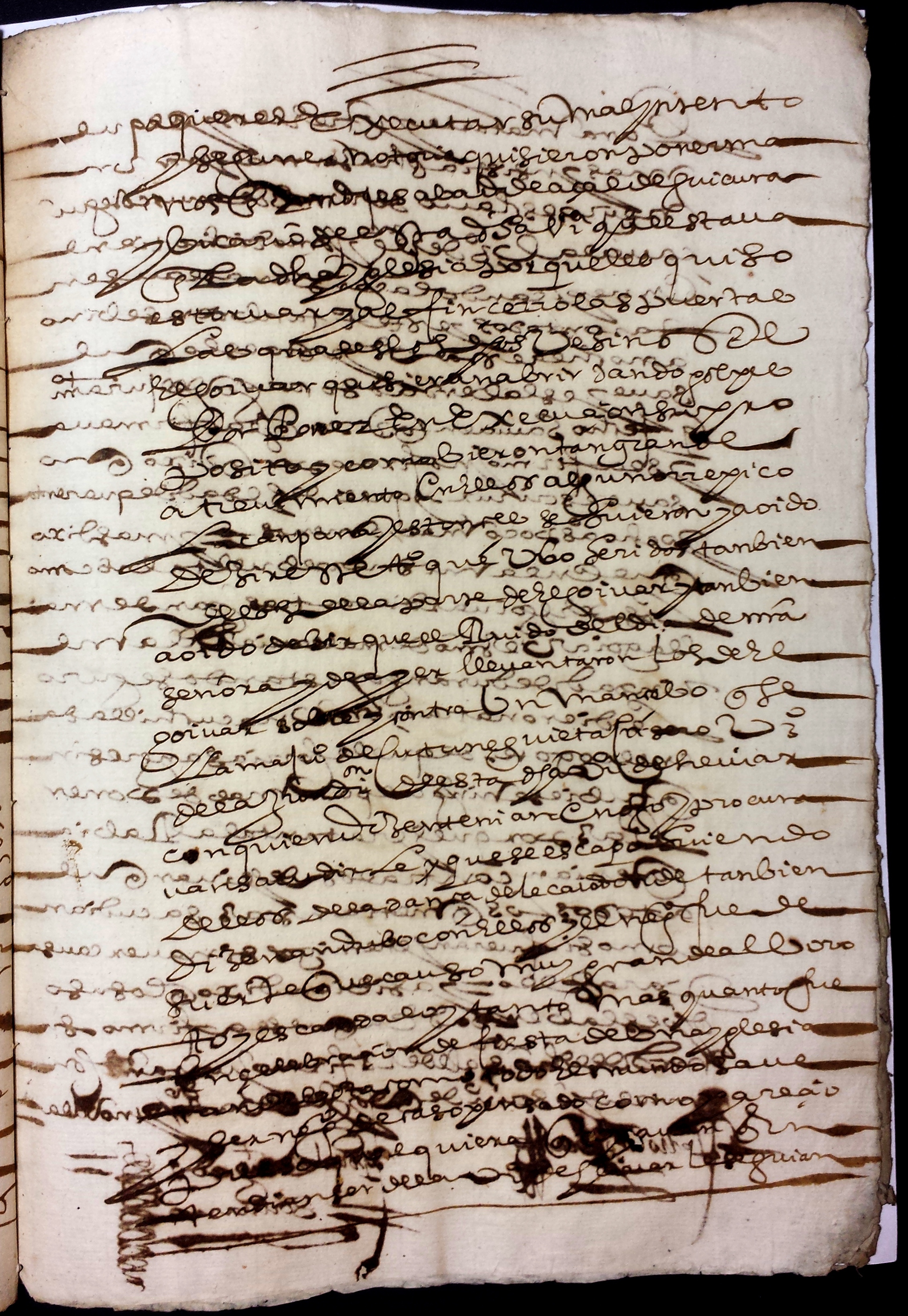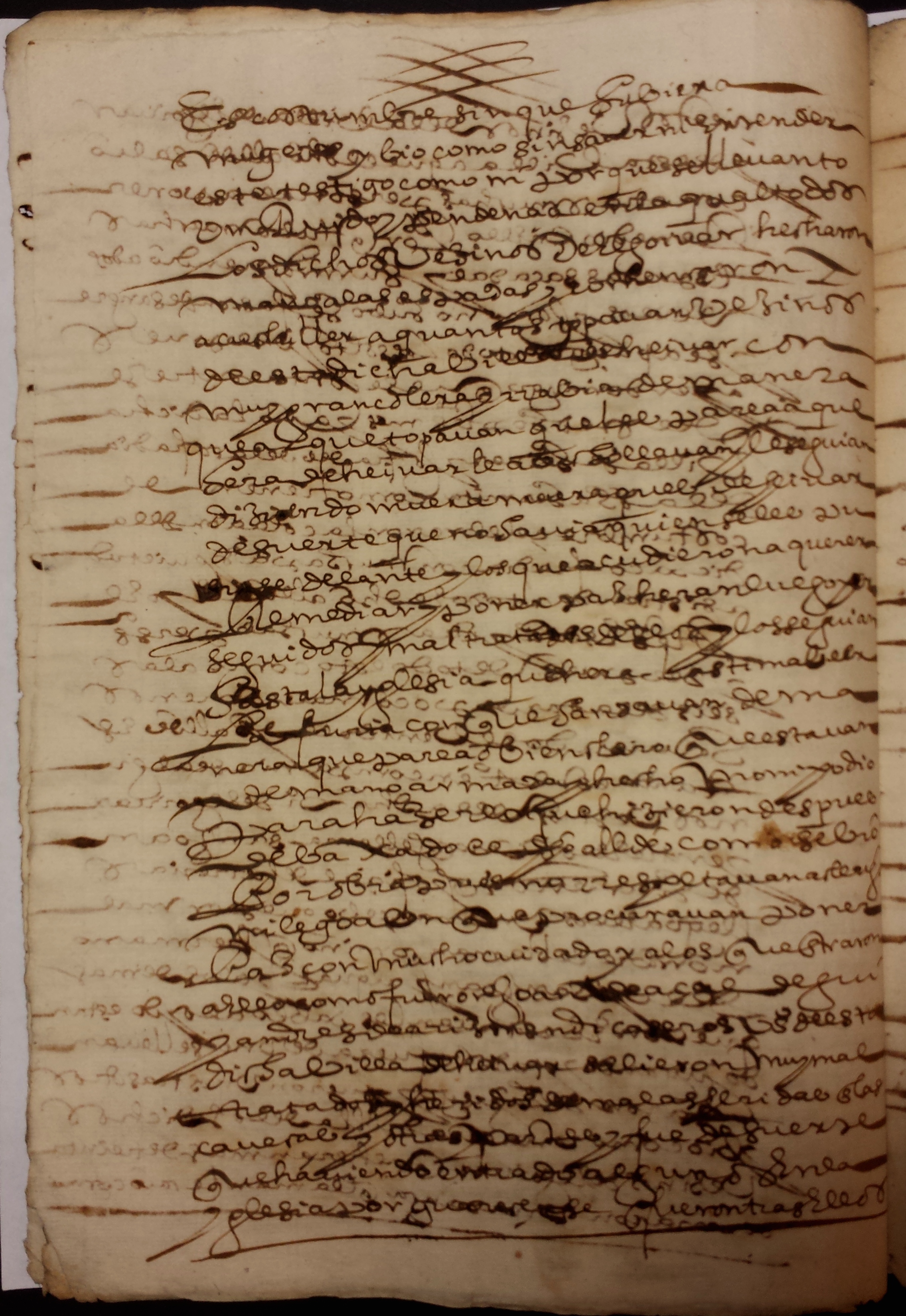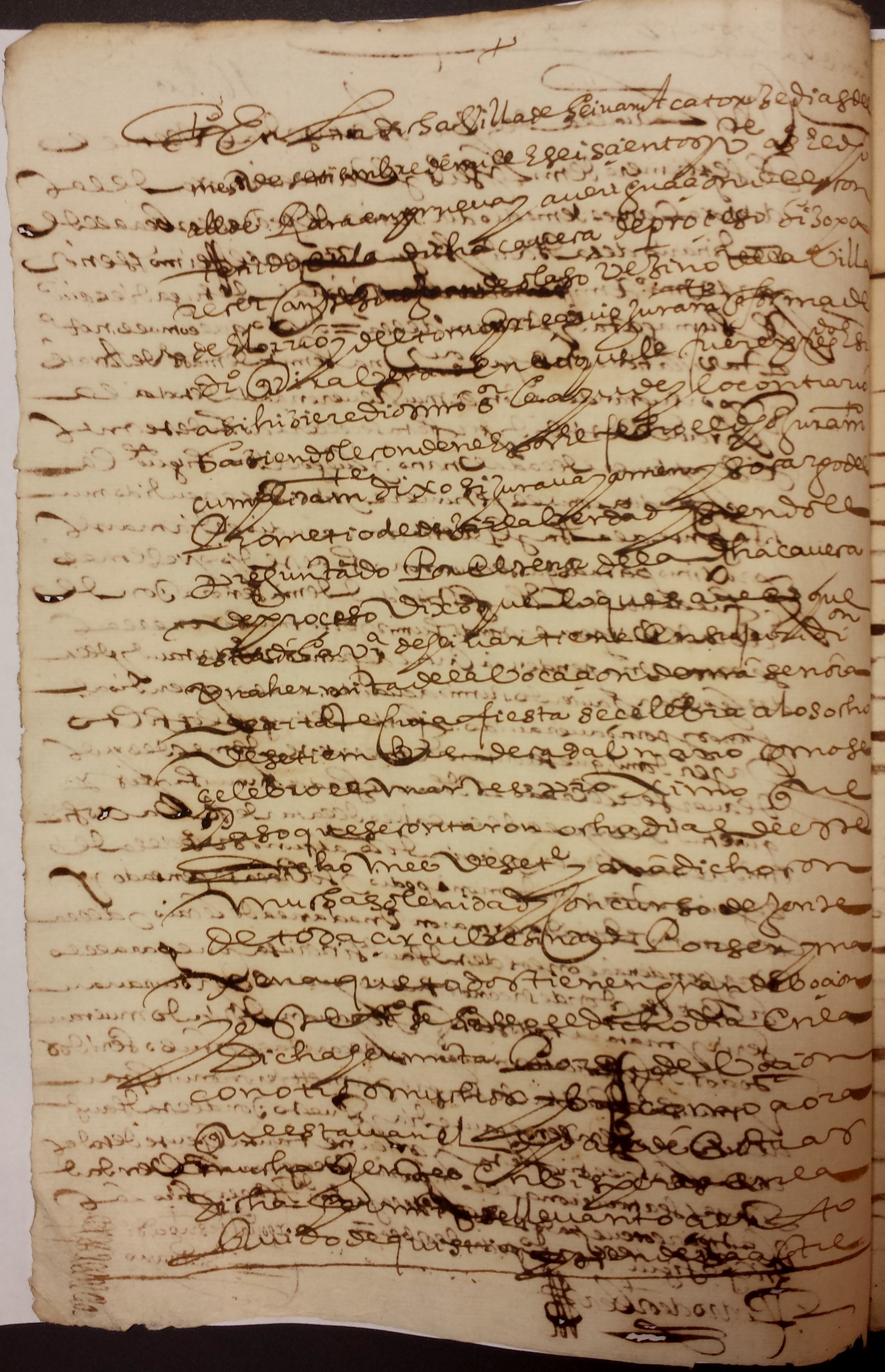 En la Villa de Eybar a catorze días del mes / de septiembre de mil y seiscientos y veinte años ora de las /diez oras antes de mediodía su merced de Pedro de Orbea alcalde / ordinario de la dicha Villa y sujurisdicción por el Rei Nuestro Señor / por testimonio de mí Cristóval de Sugadi escrivano / de SuMagestad y del Número della dixo que como es notorio / esta Villa tiene en su jurisdicción una hermita deNuestra Señora de Arrate / que por su gran devoçión es mui reverenciada de toda la / circunvezindad y sufiesta se çelebra a ocho deste mes / de septiembre de cada un año y luego el domingo siguiente la /confradía como es costumbre y siempre a acudido mu / cha gente a la dicha Iglessia como acudió el díamartes / próximo pasado que se contaron ocho deste dicho presente mes / que fue el día de la dichafestividad de Nuestra Señora donde / a ora de vísperas estando su merced y otros muchos en ellas / searmó una pendençia entre algunos vecinos desta Villa y de la / de Elgoibar y aviendo su merced acudido aello prendió al / gunos y por no aver avido efusión de sangre los soltó / y ayer domingo que se contarontreçe deste dicho mes después / de averse çelebrado la dicha confradía con mucha paz y / quietuddespués de las çinco de la tarde se baxó su / merced a esta Villa y saviéndolo algunos vecinos de la de /Eibarko Udal Artxiboan. Eskribautza Funtsa. Sig. C/291-14 Elgoivar haziendo monipodio y sobre caso pensado y / con ánimos dañados armaron una dança de lecaioy della / una pendençia con los desta dicha Villa sin causa que para ello / hubiesse donde sacando susespadas procuraran / herir y matar a todos los que topavan diziendo mueran / todos dejo resuelto mui granescándalo y hubo heridos / y mucha efusión de sangre y comettieron mui gran / delito por ser semejantedía y puesto donde esta dicha Villa / cada año haçe su fiesta y concurre tanta gente de todas / partes seatrevieron a ello y para averiguar la verdad / y castigar los culpados de oficio de la Justicia mandó haçer yhiço las diligencias siguientes firmado Pedro de Orbea /Cristóval de Sugadi, escrivano/Pedro de Orbea //En la dicha Villa de Heivar a catorze días del / mes de setiembre de mil e seiscientos veinte dias el dicho /alcalde para en prueba y averiguacion del con / tenido de la dicha cabeza del proceso dixo com / parecerante si a Joan de Olaso vecino de la villa / de Elorrio y dél tomó y reçivió juramento en forma de / derechoque dirá verdad en todo que le fuere preguntado si / así hiziere Dios Nuestro Señor le ayude y lo contrario /haziendo le condene e por él fecho el dicho juramento / cumplidamente dixo si jurava y amen y so cargodel / prometió dezir la berdad y siéndole /Eibarko Udal Artxiboan. Eskribautza Funtsa. Sig. C/291-14 preguntado por el tenor de la dicha caveza / de proceso dixo quelo que sabe es que / que en esta dicha Villa de Heivar tiene en su jurisdicción /una hermita de la vocaciónde Nuestra Señora / de Arrate cuya fiesta se celebra a los ocho / de setiembre de cada año como se /celebró el martes próximo y pasó / que se contaron ocho días de este / dicho mes de setiembre y añodicho con / mucha solenidad y concurso de gente / de toda la circuvezindad por ser ima / xen a que todostienen gran debocion / y este testigo se halló en la / dicha Hermita por ser devoción / con otros muchos ybio como a ora / que estaban el dicho alcalde e otras / muchas gentes en vísperas en la / dicha hermita sellevantó çierto ruido / de quistion y de pendençia entre // ciertos vecinos de la dicha Villa de Elgoivar / y deesta Villa a que el dicho alcalde salió / con otras muchas personas a poner / remedio en ello porque hubomuchas / espadas sacadas y su merced prendio a dos / de ellos y como no hubo hefusion de sangre/ y seapaciguo todo lo solto y despues /ayer domingo que se contraron treze / de este dicho presente mes yaño la dicha / villa de Heibar y cofrades de la cofradia / de la dicha hermita como tiene de / costumbrecelebro la colacion de la / dicha cofradia con mucha paz y quieuts / asisitiendo al dicho alcalde y yo el /presente escribano y otras muchas personas / y despues de todo esto como a las / seis de la tarde pocomas o menos/ haviendose venido el dicho alcalde es / tando este testigo en compañia de algu /Eibarko Udal Artxiboan. Eskribautza Funtsa. Sig. C/291-14 nosvecinos de la dicha villa de Elgoivar / y entre ellos uno que se llama San Joan de Hiumendi que es oficialde herrerias / llego a ellos un mancebo que por mal / nombre le llaman comino que es hermano / del dichoSan Joan al cual y a los demas / que con el estavan les hablo al oido estan / do jugando y todos fuera deuno se levan / taron del juego y fueron unos tras otros / y vio como una quadrilla de los dichos / vezinos deElgoivar que eran mas de treinta / armaron una dança que llaman lecaio // como es costumbre sin quehubiera / mujeres y vio como sin saver ni entender este testigo como ni porque se levanto / un ruido ypendencia en la qual todos / los dichos vezinos de Elgoivar hecharon / mano a las espadas y començarona / acuchillar a quantos topavan vezinos de esta dicha villa de Heibar con / muy gran colera y rabia demanera / que al que topaban que les parecia que / hera de heivar le acuchillavan y le seguian diciendomuera muera que es de Heivar / de suerte que no havia quien se les pu / siese y los que acudieron aquerer / remediar y poner paz heran luego per / seguidos y maltratados de ellos y los seguian / hasta laiglesia que hera lastima veer / la furia con que handaban de ma / nera que pareçio bien claro que estavan /de mano armada y hecho monipodio / para hazer lo que hizieron despues / de baxado el dicho alcaldecomo se vio / por obra pues no respetavan a clerigo / ni lego aunque procuraban poner / paz con muchocuidado y a los que entraron / a ello como fueron Juan de Açaldegui / y Andres de Arizmendi caserosvecinos de esta /Eibarko Udal Artxiboan. Eskribautza Funtsa. Sig. C/291-