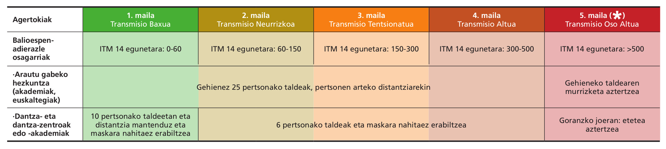 - Maila, transmisio baxua (eremu berdea), azken 14 egunetan 100.000 biztanleko 0-60 positibo: 10 pertsonako taldeetan eta distantzia mantenduz eta maskara jarrita dantza egiteko aukera.