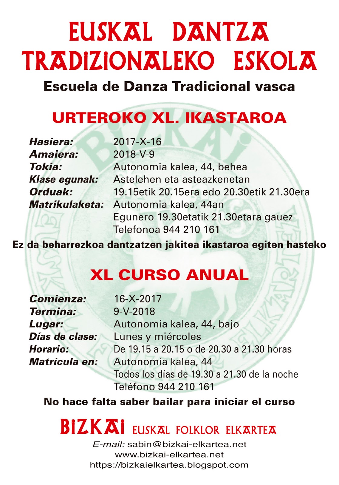 Bizkai euskal folklor elkarteak euskal dantza tradizionala ikasteko aukera eskaintzen dizu aurten ere. Hurrengo urriaren 16an, urtero bezala, gure XL. ikastaroari emango diogu hasiera eta 2018ko maiatzean 9an bukatuko dugu.