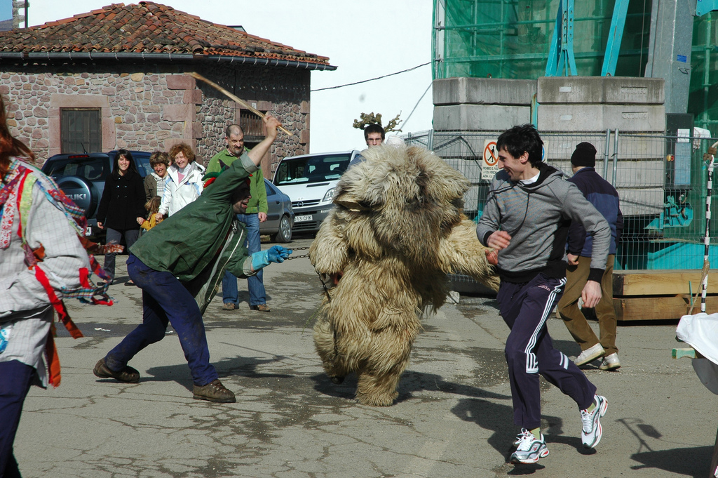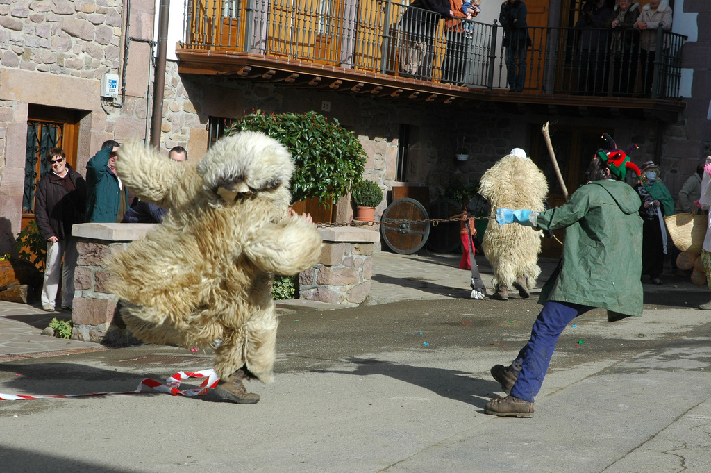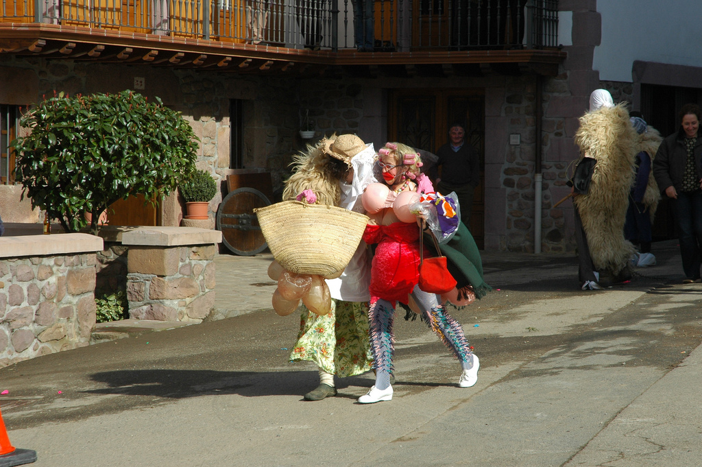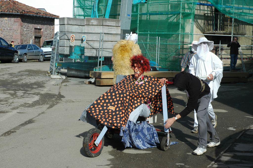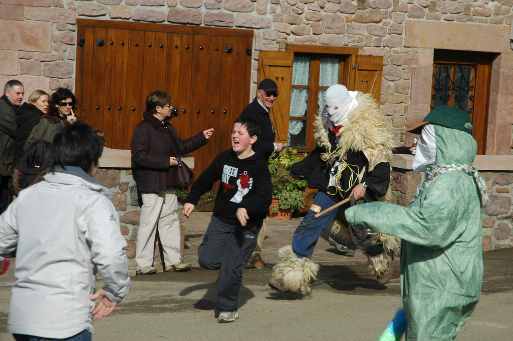 Halako batean hasi dira agertzen mozorroak. Zirujia estetikoko karroza eta bere kideak, polizia foralaren kotxea eta kontrola, eta mozorro barregarri eta basatiak. Horietako batzuk, ardi-larruak bizkarrean eta aurpegia estalita jendea astintzen dute adar luze batzuekin. Hartza ere atera da eta korrika saioak eta izuak hasi dira. Hartza basatia eta eroa da benetan, eta domadoreak ere epelak eman eta hartzen ditu. Txistulariek klarineteak hartu dituzte eta haiekin beste hainbat musikari bildu dira.