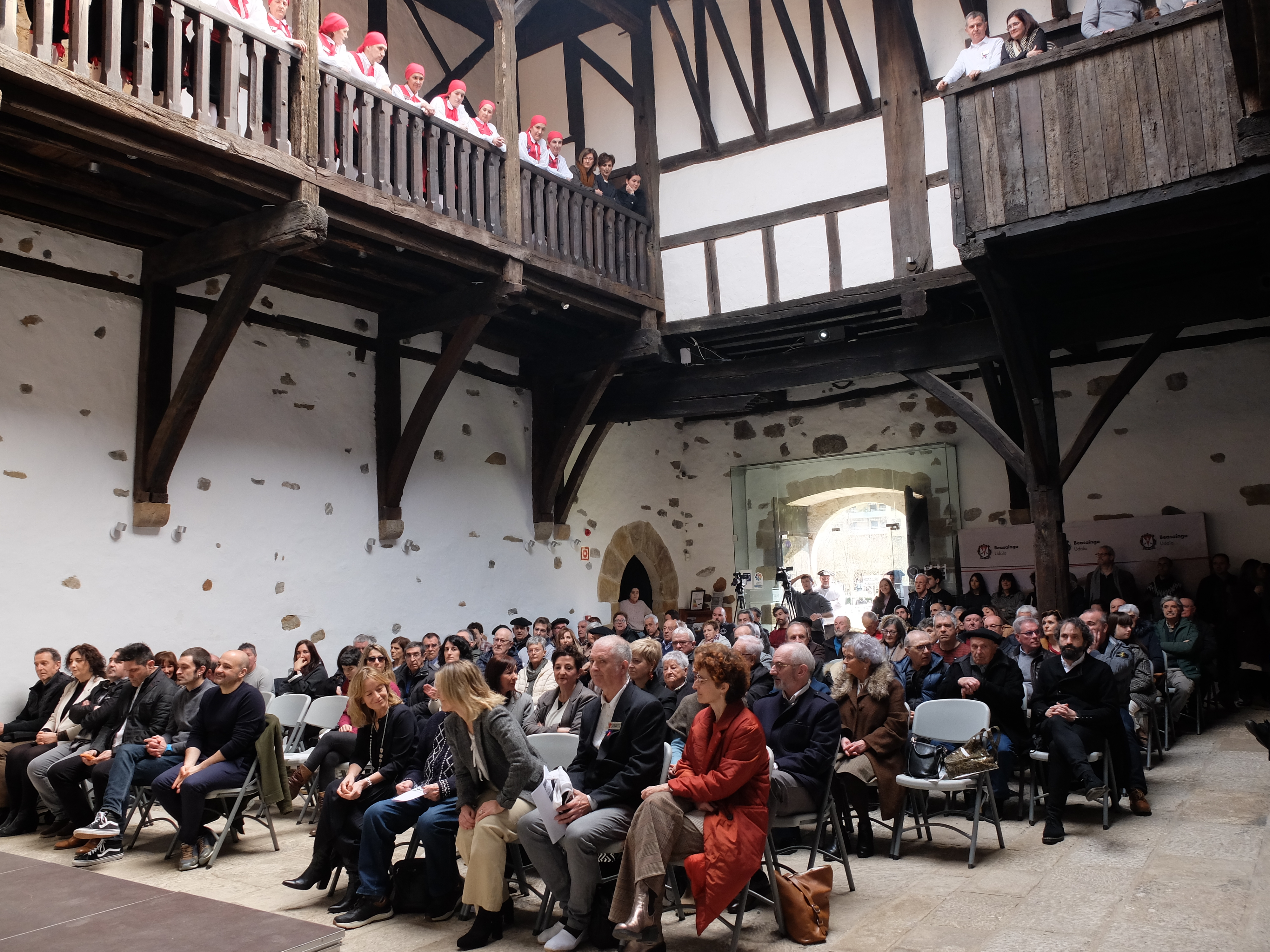 Zubitik segizioan joan dira jauregiko atera eta ezpaten arkua osatu dute atean gonbidatuak azpitik pasa daitezen. Hango eta hemengo dantzariak, dantza-maisuak, euskal dantzaren inguruko erreferente ugari pasatzen hasi dira arkupetik jauregira sartzeko. Bai ordezkari instituzionalak, bai eta Mikel Sarriegiren familia eta lagunak ere. Euskal dantzari buruzko liburu baten aurkezpenera batu den erakundeetako ordezkaritzaren zerrenda ere bada zerbaiten adierazgarri: Eider Mendoza, Gipuzkoako Ahaldun Nagusia; Maria Jose Telleria, Gipuzkoako Diputazioaren Kultura Zuzendaria; Leire Artola, Beasaingo alkatea; Adur Ezenarro, Ordiziako alkatea; Mikel Serrano, Zumarragako alkatea; Ioritz Berra, Zaldibiako alkatea; Izarra Urdaileta, Segurako alkatea; Iñaki Olalde, Oñatiko kultura zinegotzia; Mariola Pascual, Beasaingo kultura zinegotzia; Adur Ugartemendia, Beasaingo alkate-ordea; Mikel Apaolaza, Beasaingo udalaren komunikazio arduraduna. Aranzadi zientzia elkartearen ordezkaritza ere bete-betekoa da: Jokin Otamendi Aranzadiko lehendakaria, Juantxo Agirre-Mauleon idazkari-nagusia, Eider Conde komunikazio arduraduna eta Olatz Ezeiza komunikazio teknikaria.