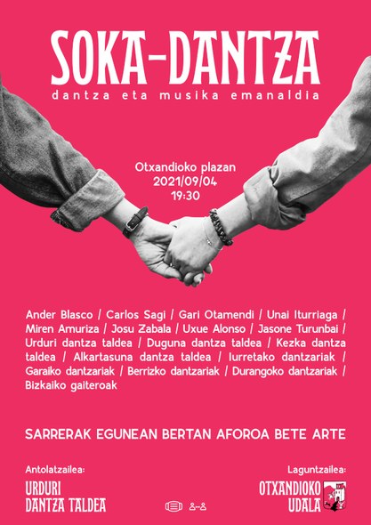 Soka-dantza edo aurreskua ardatz izango duen ekitaldia antolatu dute larunbatean, irailak 4, Otxandioko plazan. Otxandioko Urduri dantza taldea, Iurretako, Garaiko, Berrizko, Garaiko eta Durangoko dantzariak izango dira plazan Durangaldeko eran dantzan, baina horiez gain Iruñeko Duguna, Eibarko Kezka eta Bermeoko Alkartasuna dantza taldeko kideek ere plazaratuko dituzte sokak. “Euskal Herriko hainbat soka-dantza erakutsi eta bata bestearen arteko antzekotasunak zein ezberdintasunak ikusteko aukera sortzea izan da asmoa”, azaldu digu Abasolok.