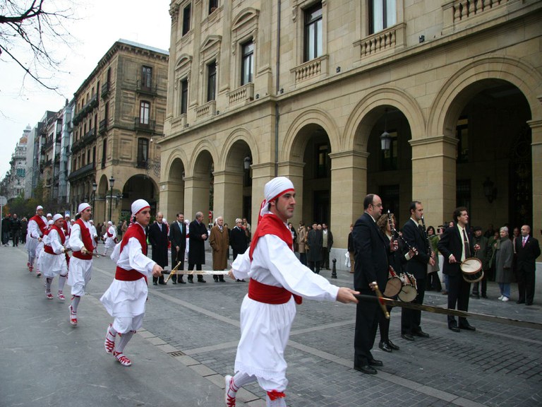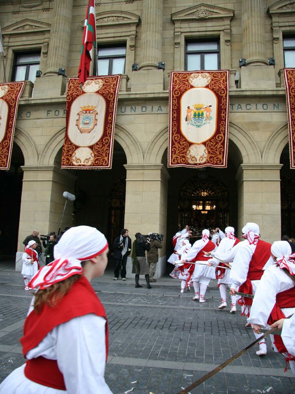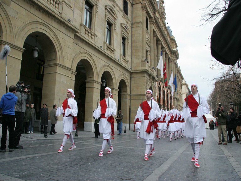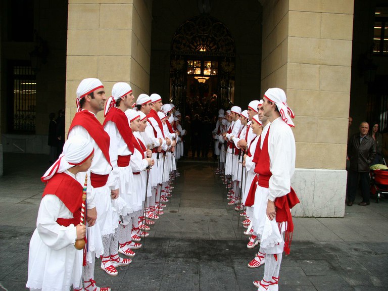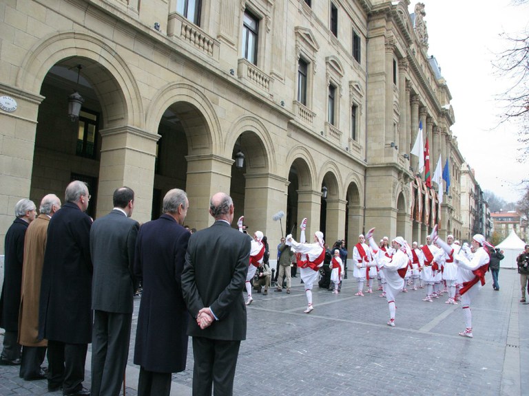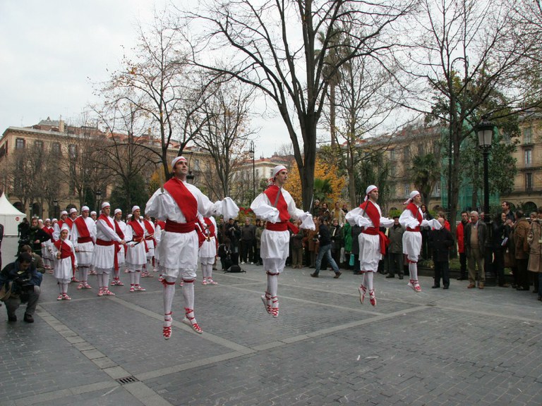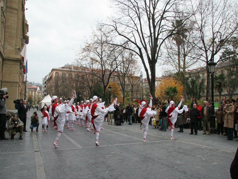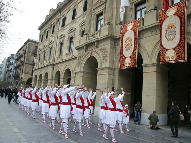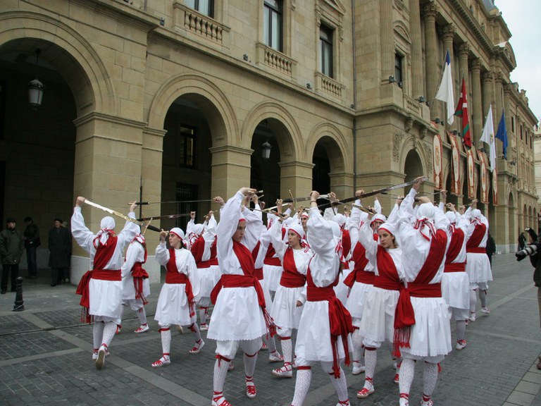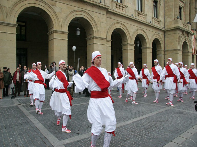 Ezpata-dantza Donostian, Gipuzkoako Foru Aldundiak ematen dituen urrezko dominen ekitaldian, 2005eko abenduaren 15ean. Elgoibarko Haritz dantzari taldea, Debako Gure-Kai dantzari taldea, Arkaitz Añorgako dantzariak eta Eibarko Kezka dantza taldea.