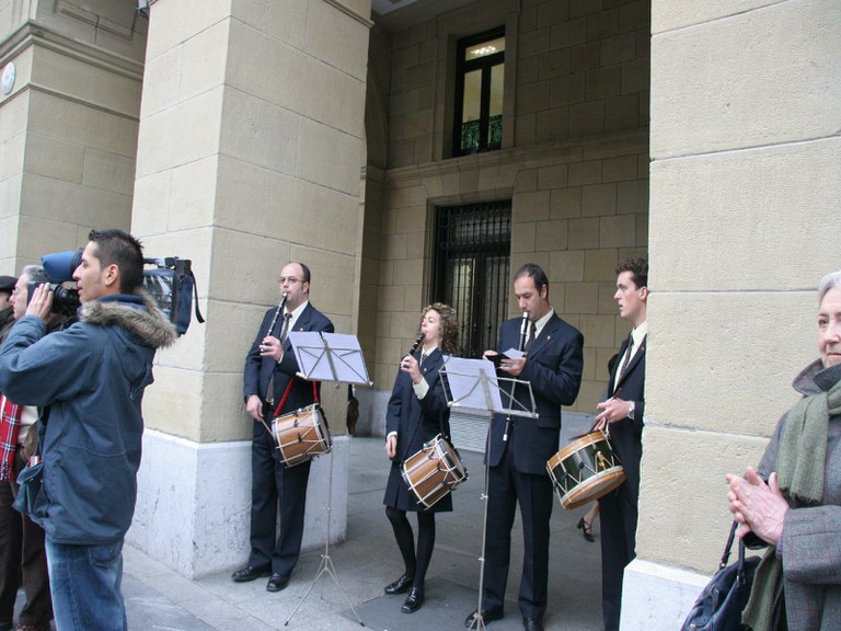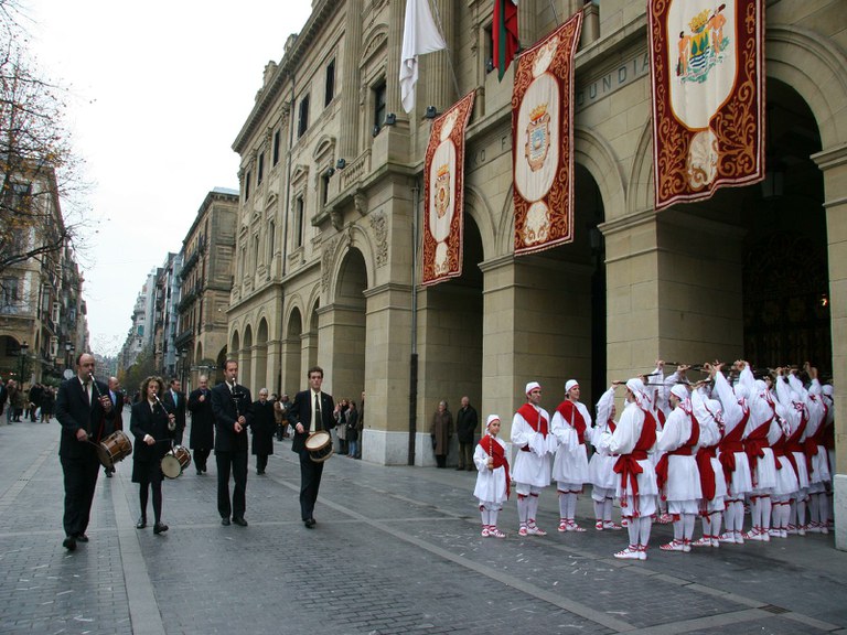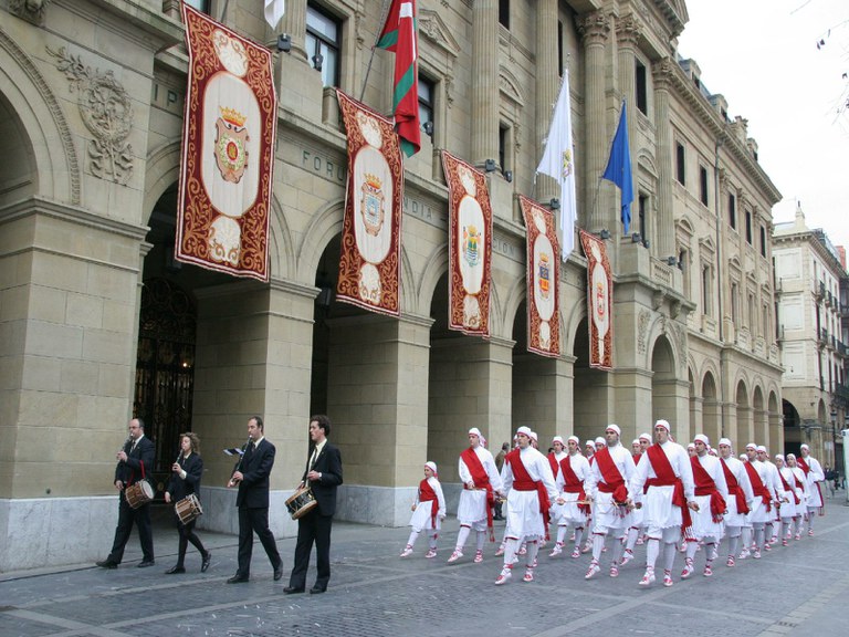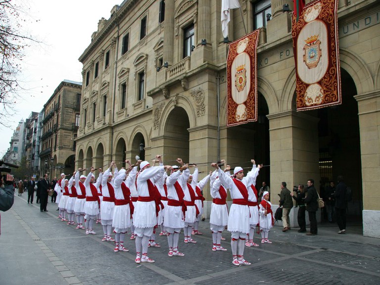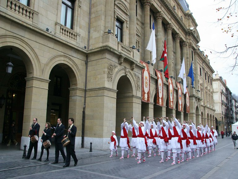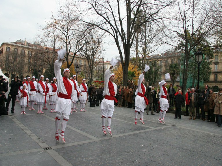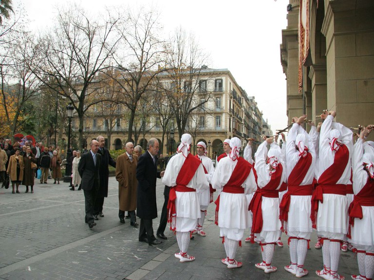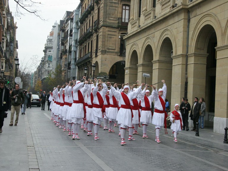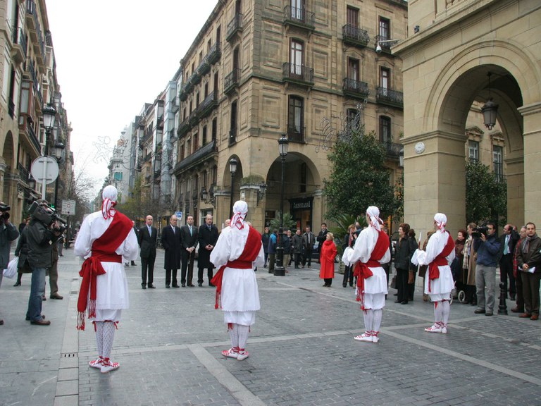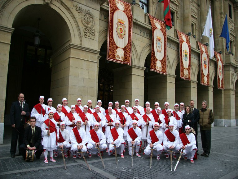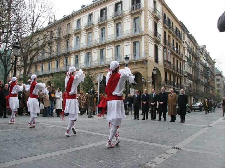 Ezpata-dantza Donostian, Gipuzkoako Foru Aldundiak ematen dituen urrezko dominen ekitaldian, 2005eko abenduaren 15ean. Elgoibarko Haritz dantzari taldea, Debako Gure-Kai dantzari taldea, Arkaitz Añorgako dantzariak eta Eibarko Kezka dantza taldea.