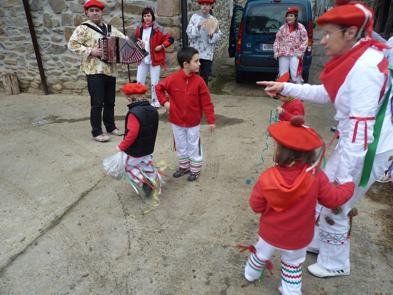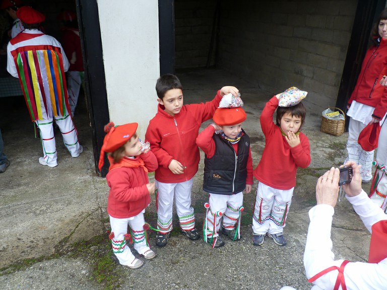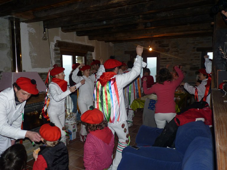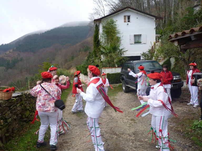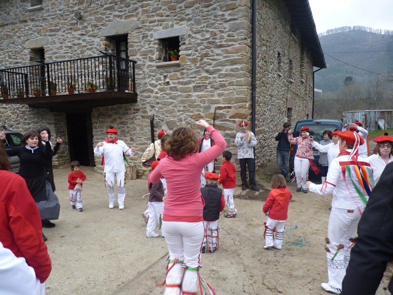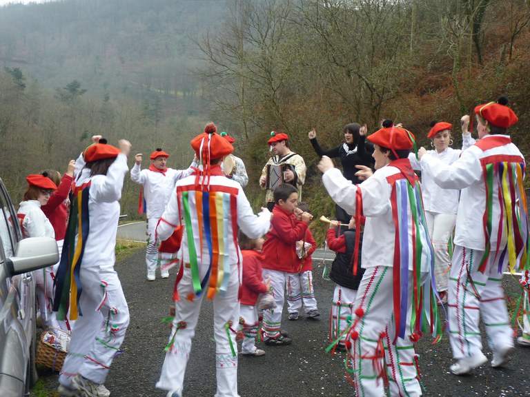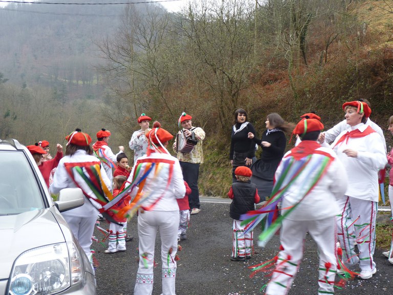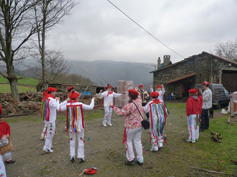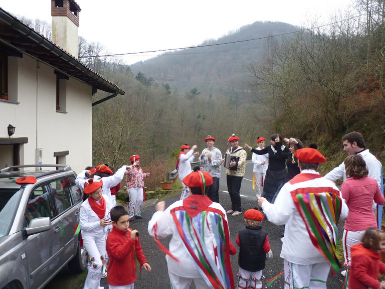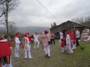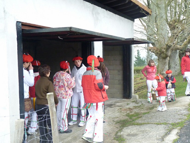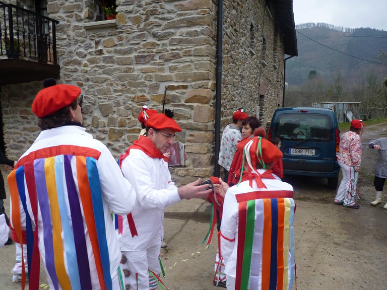 Inauterien azkenaurreko asteburuan irteten dira zomorroak Aranon. Goizean goiz herriko plazan geratu eta baserriz baserri joaten dira fandango eta arin-arina dantzatuz giro ederrean. Puska-biltzea egin ostean, elkartean bazkaldu eta zagi-dantza egin ohi dute arratsaldean. Argazkietan, goizeko puska-biltzea ikus dezakezue. Argazkiak: Beñat Lopez. Arano, 2011-02-26.