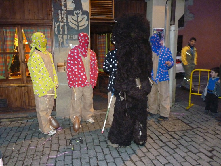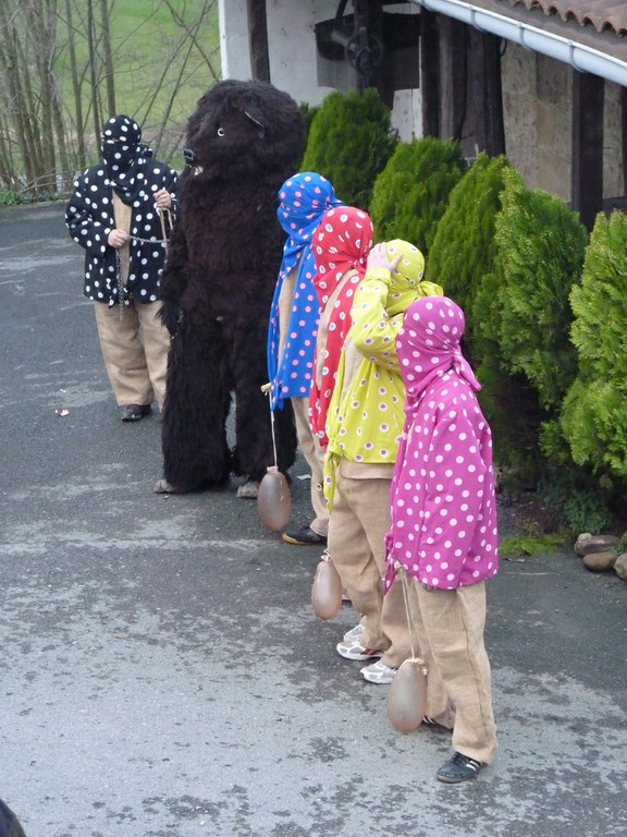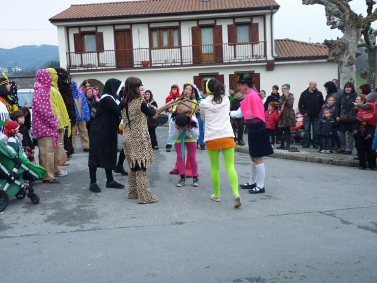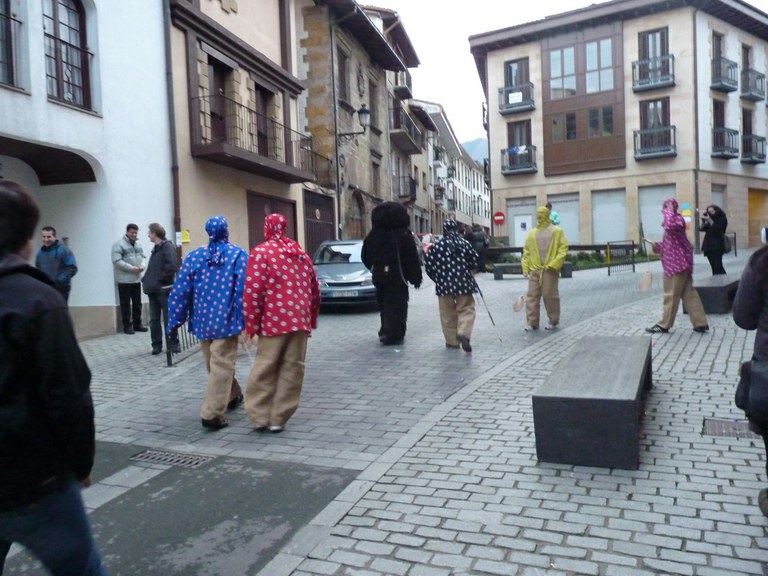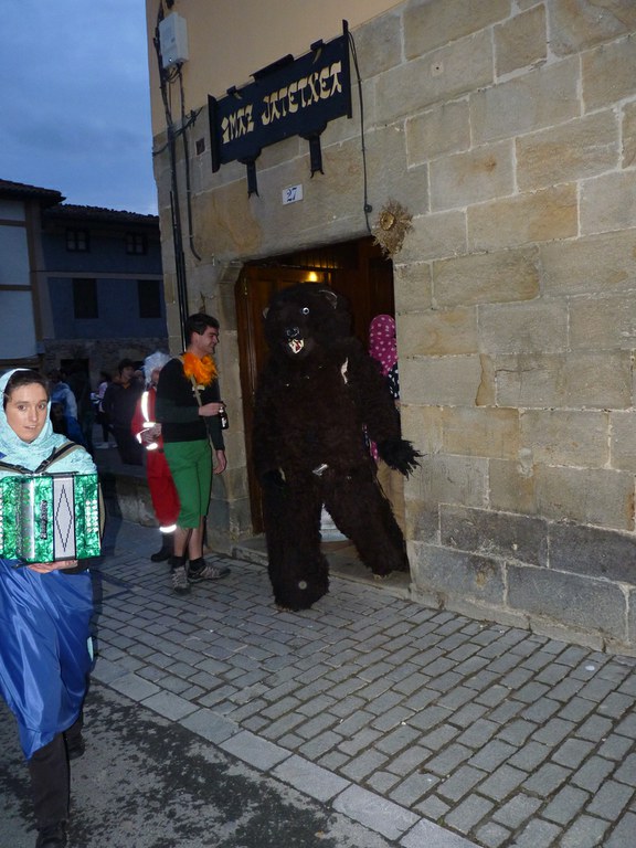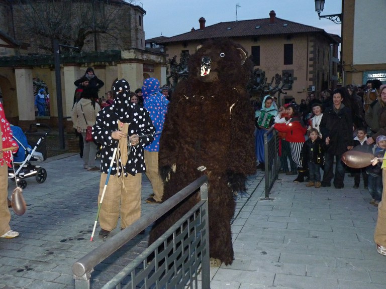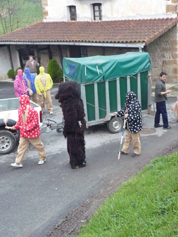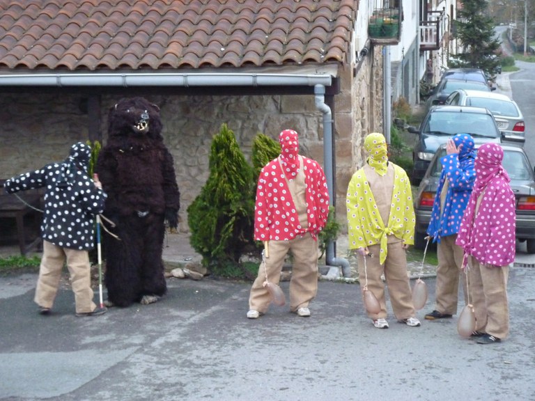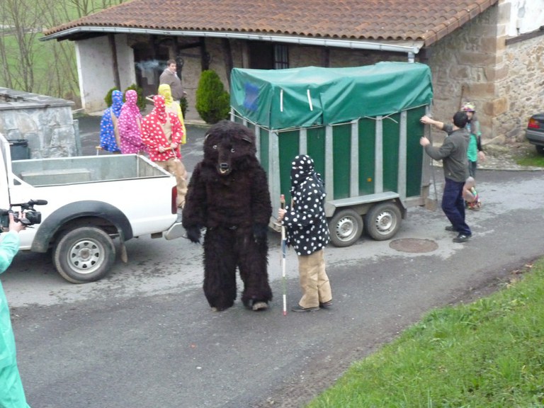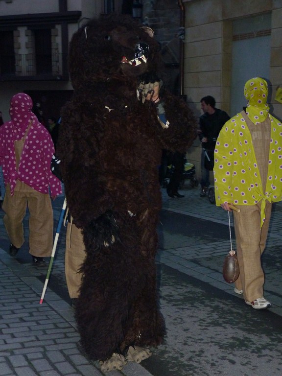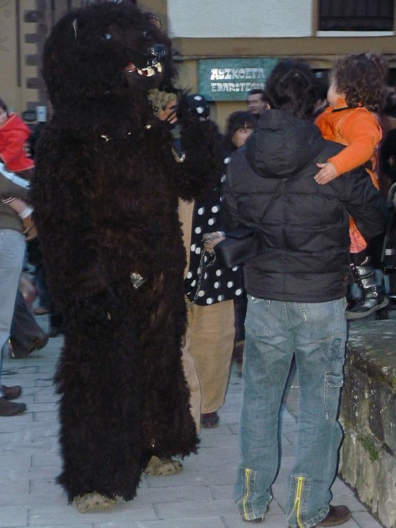 Garai bateko ohitura berreskuratuz lau urte dira hartza Aizkorritik Segurara jaisten dela ostiral mehe egunean. Bere inguruan ibiltzen dira uxatzaileak, aurrean harrapatzen duten edonori maskuri edo puxikarekin jotzeko. Herriko puntu ezberdinetan, herriko gazte talde batek, bakoitzak bere mozorroa jantzita duela, jorrai-dantza dantzatzen du. Argazkiak: Jon Iraola, 2011-03-04.