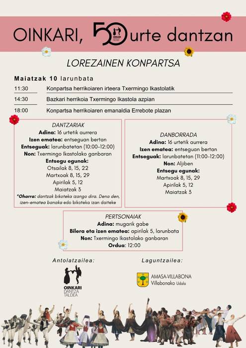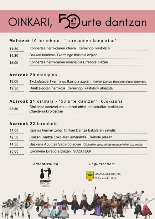 Oinkari dantza taldeak 50 urte beteko ditu azaroan eta urtemuga ospatzeko hainbat ekitaldi egingo ditu azaroaren 20tik 22ra. Horren aurretik, ordea, maiatzaren 10ean, Lorezainen konpartsa aterako dute. Otsailean hasiko dituzte konpartsa prestatzeko entseguak.