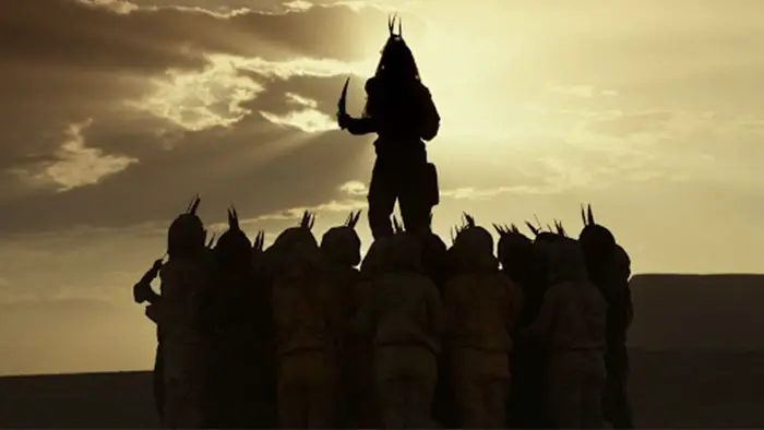 The dancers in Dantza, much like the troupe in the hugely popular dance show Stomp, have an affinity for utilizing whatever tools they have at their disposal to make music. The electrifying opening number, for example, takes place on the dry, cracked desert floor as a group of men till the soil with hoes that double as percussion instruments. So dynamic is this sequence that it culminates in the group literally conducting electricity from the skies!