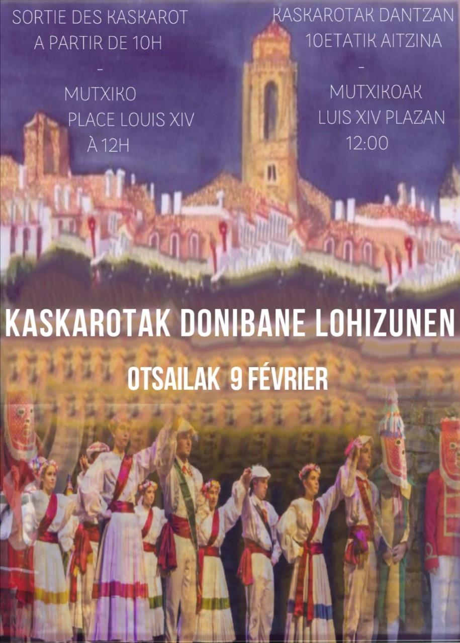 Aurten, aspaldiko partez, kaskarotak aterako dira Donibane Lohizunen otsailaren 9an. Goizeko 10etatik goiti dantzan aterako dira Gambetta Karrikan, zenbait geldialdi eginez plaza nagusietan. Ongi bukatzeko Mutxikoak izanen dira 12etan Luis XIV plazan, taldeko txarangak emanik.