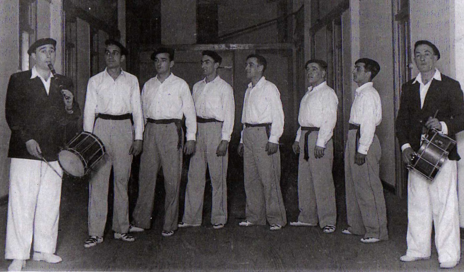 1934. Ulialde, Groseko Batzokiaren inaugurazio egunean auzoko kaleetan jira egiten. Txistularia, Patxi Mugerza. Joxe Mari eskuin aldeko lehen dantzaria, atabalariaren ondoan.