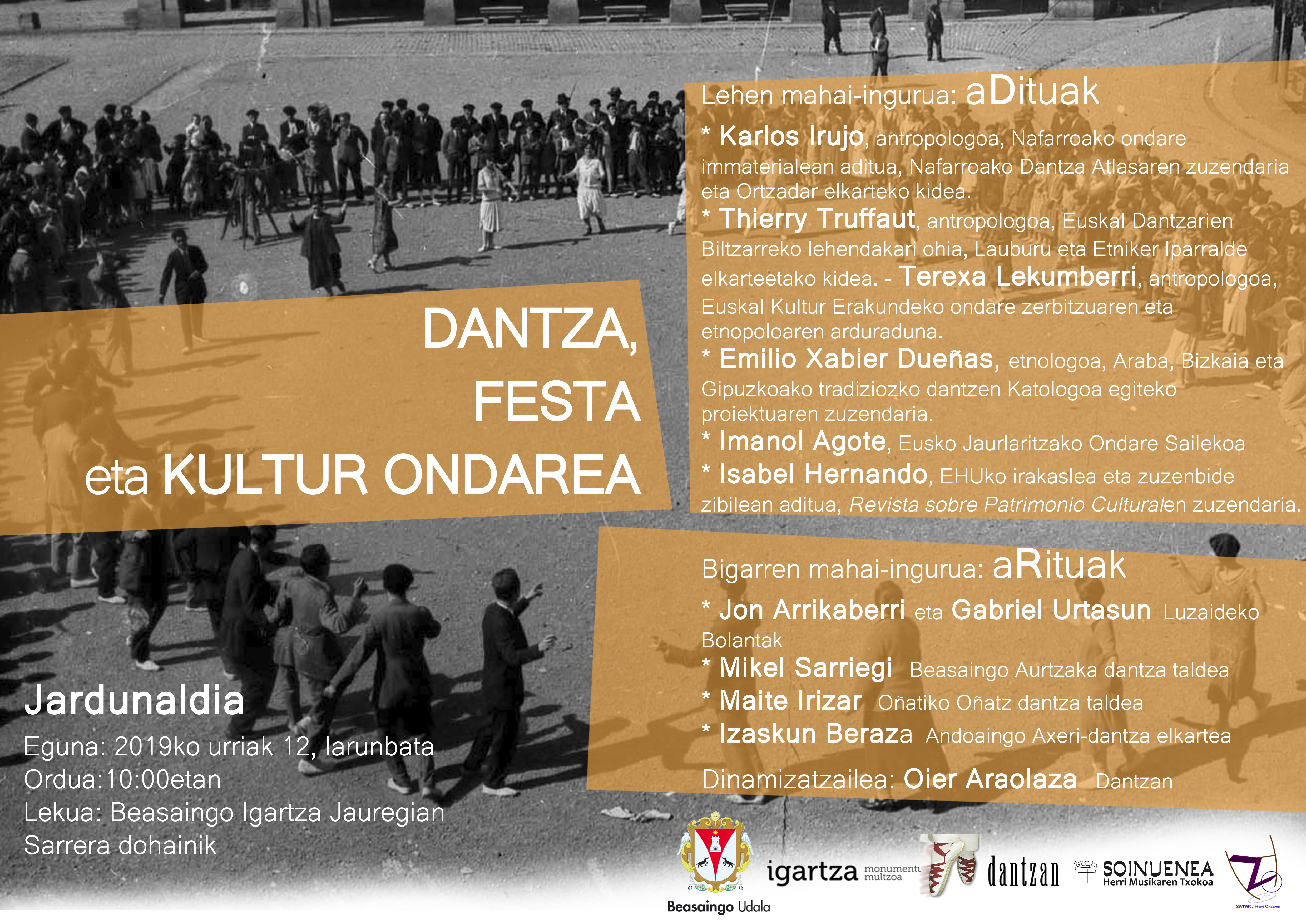Ondare immateriala eta dantzari dagokionez Nafarroan, Iparraldean eta EAEn aurrera ematen ari diren jardueren berri emango dute Karlos Irujok, Thierry Truffaut-ek, Terexa Lekunberrik eta Emilio Xabier Dueñasek. Nafarroako ondare immaterialean aditua da Karlos Irujo antropologoa, Ortzadar elkarteko kide eta Nafarroako Dantza Atlasaren zuzendari baita besteak beste. Terexa Lekunberri antropologoa Euskal Kultur Erakundeko ondare zerbitzuaren arduraduna da eta berarekin izango da Thierry Truffaut antropologoa, Iparraldean egiten ari diren ondare immaterial fitxen egileetakoa dena. Zatak elkarteko Emilio Xabier Dueñas etnologoa, Araba, Bizkaia eta Gipuzkoako tradiziozko dantzen katalogoa egiteko proiektuaren zuzendaria da.