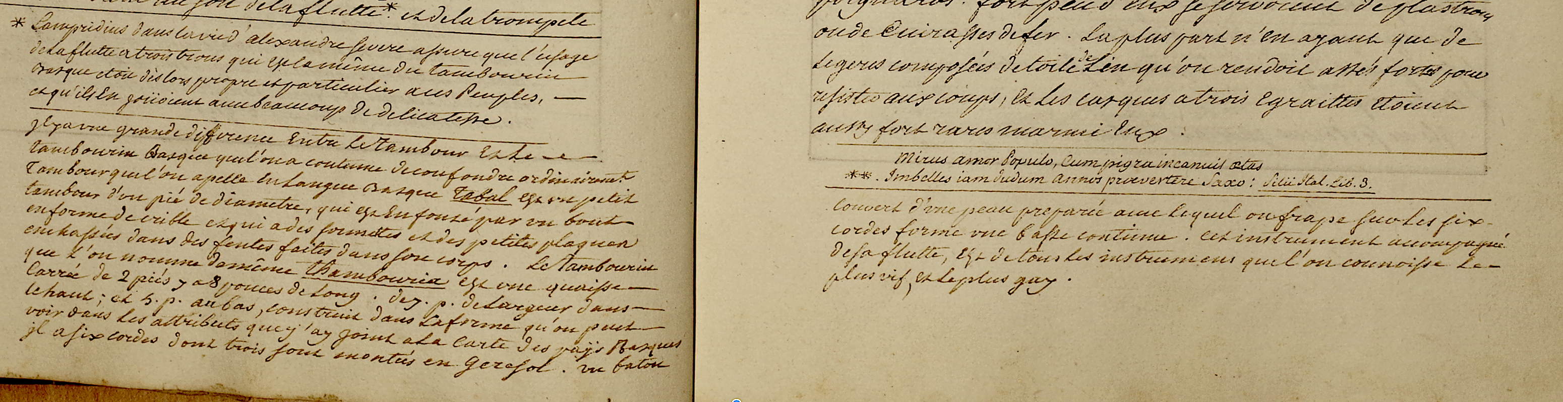 Yl y a une grande difference entre le Tambour et le tambourin Basque que l’on a coutume de confondre ordinairement. Tambour, que l’on apelle en langue Basque Tabal, eſt un petit tambour d’un pié de diametre, qui eſt enfonzé(?) par un bout en forme de crible, et qui a des ſormettes(?) et des petites plaques enchaſsées dans des fentes faites dans ſon corps. Le Tambourin, que l’on nomme demême Thambouria, est une quaiſse carrée de 2 piés, 7 a 8 pouces de long. de 7 p. de largueur dans le haut et 5. p. au bas, construit dans la forme qu’on peut voir dans las attributs que j’ay joint a la carte des paÿs Basques. Yl a ſix cordes, dont trois ſont montées en geresol. Un baton // couvert d’une peau preparée avec lequel on frape ſur les ſix cordes forme une baſse continue. Cet instrument, accompagné de la flutte, est de tous les instrumens que l’on connoiſse le plus vif et le plus gay.