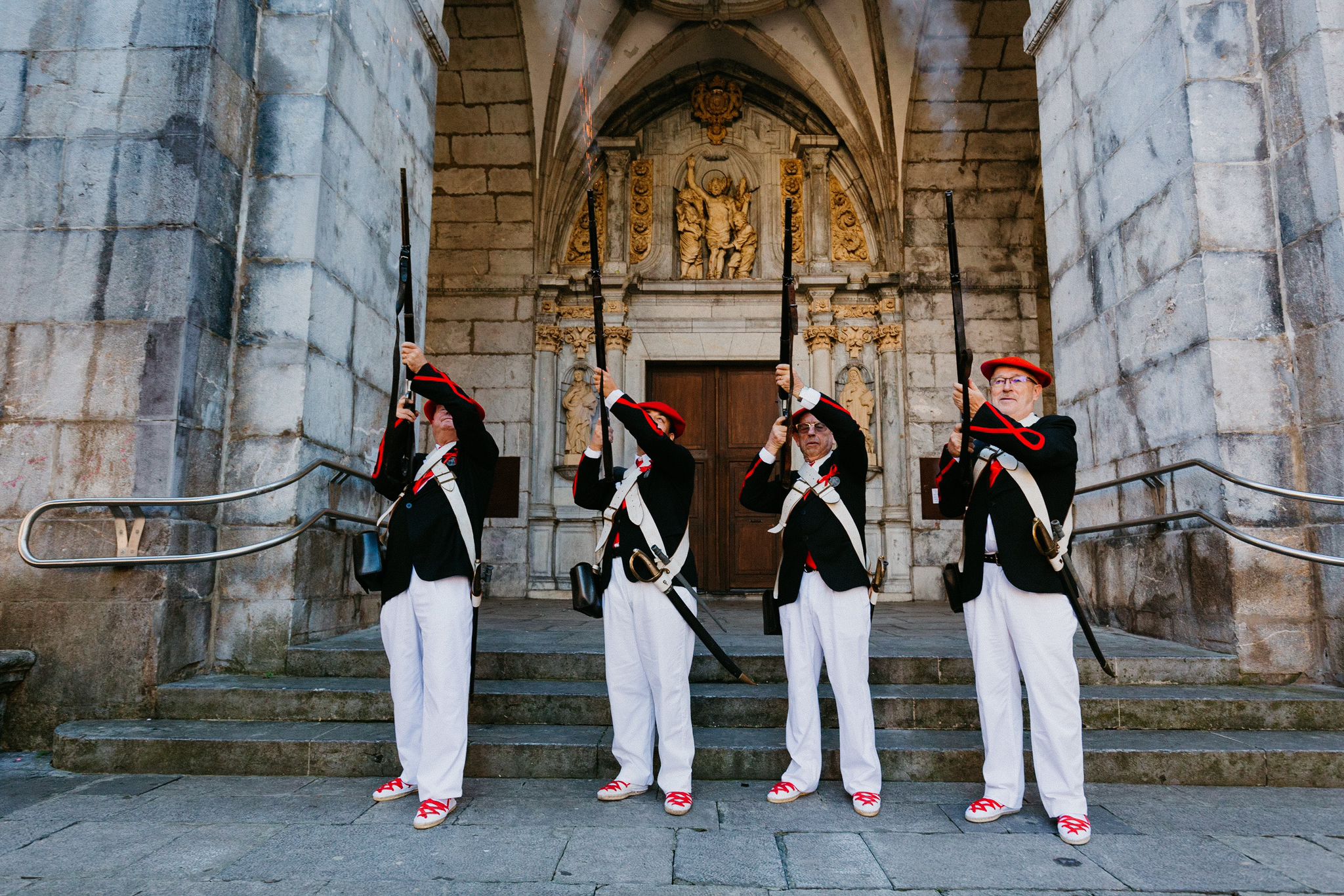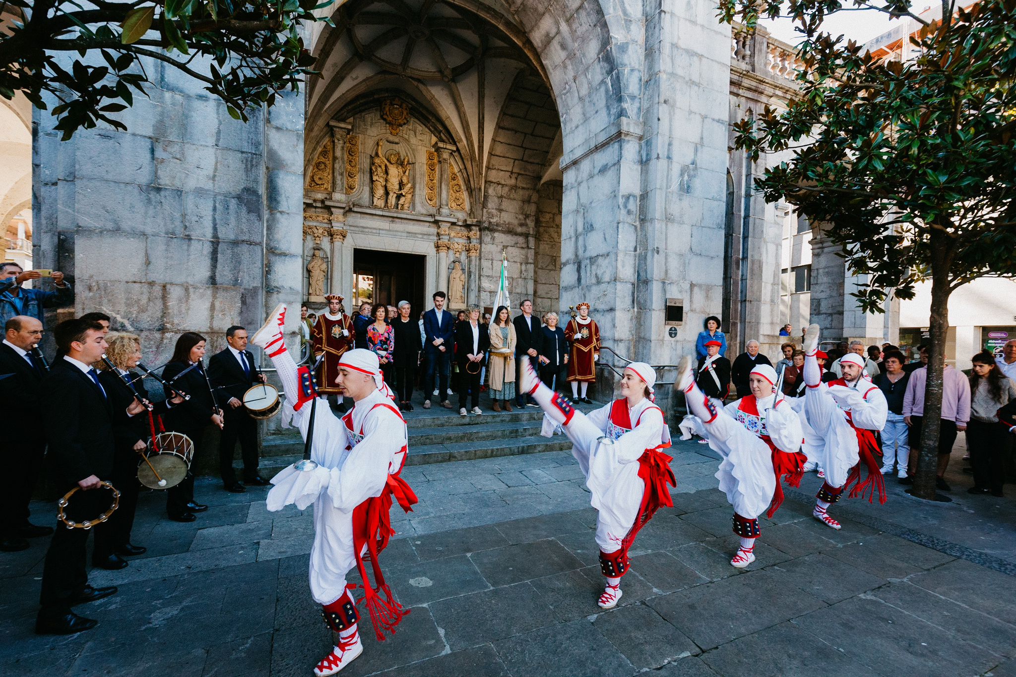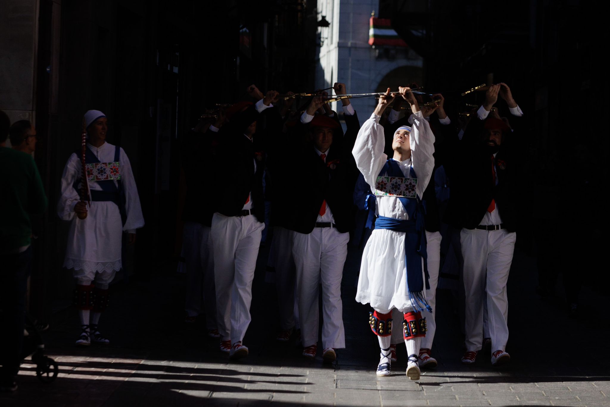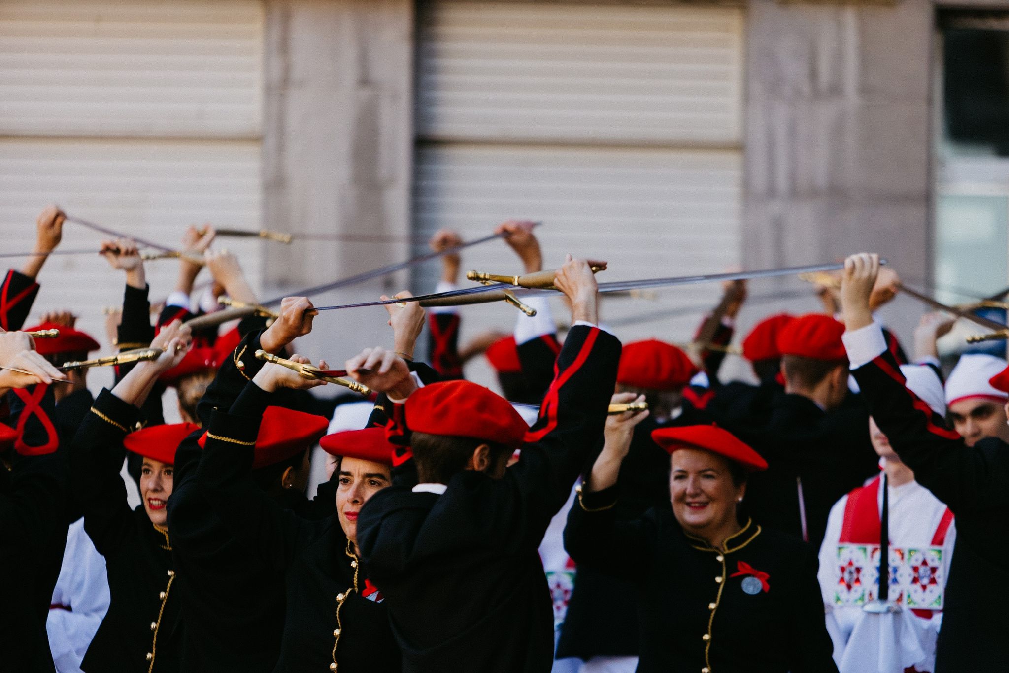 Bi urteko geldialdiaren ostean, goizean goiz hasi ginen prestaketa lanak egiten. Ezpata txikien soinu hotsa, lehen aldiz dantzatu behar zutenen urduritasuna, azkenengo momentura arte jantzi gabe egoten direnen patxada... denak normaltasun kutsu bat hartu zuen. 10:45ean talde osoa udaletxeko arkupeetan elkartu zen dantzarako prest. Lehen geldialdia San Bartolome parrokian egin ohi dugu, aurten berritasun batekin. Urte luzez Elgoibarko parroko izan den Don Benantziok merezitako erretiroa hartu eta abade berriari lekua utzi zion.