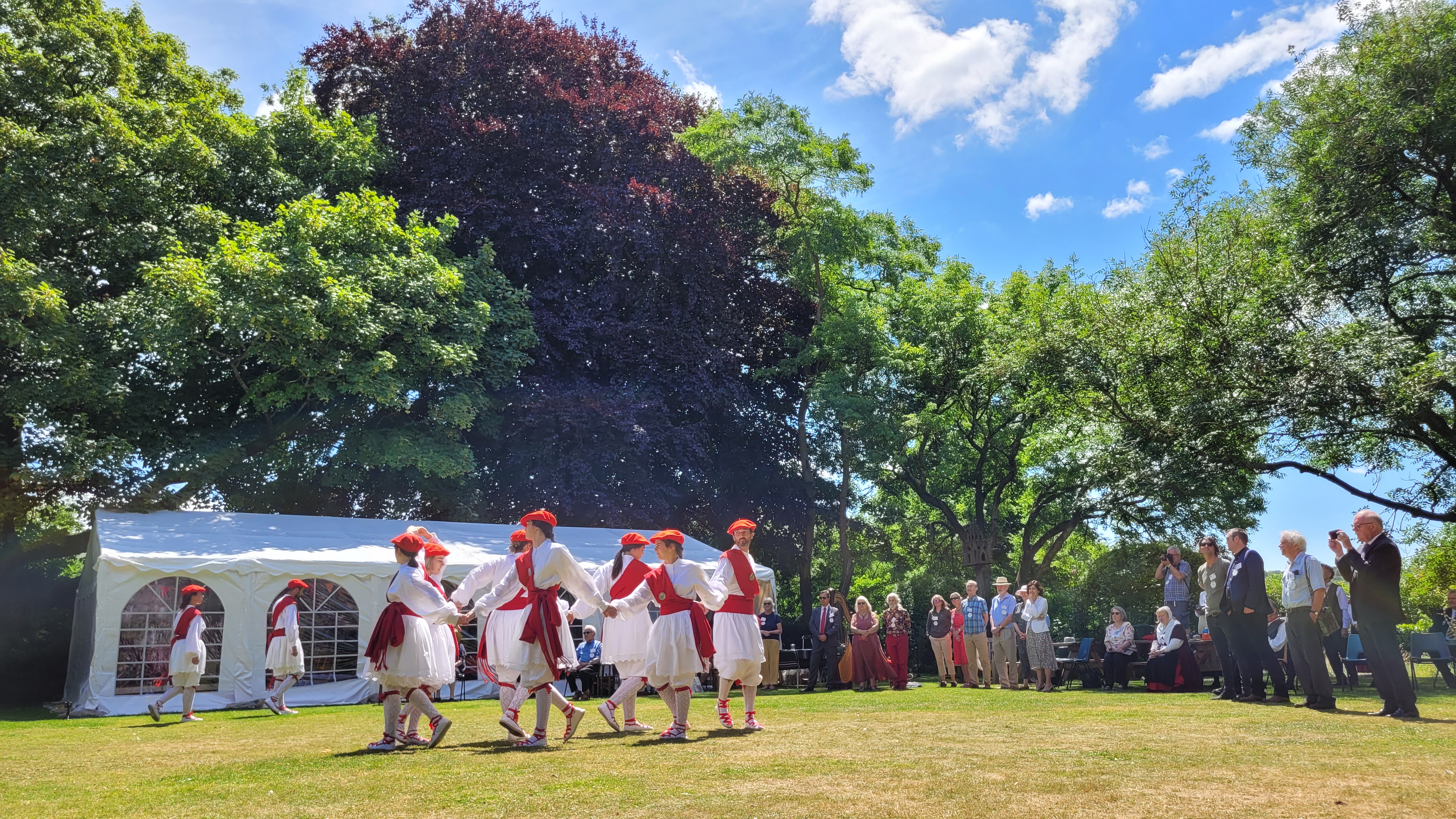 Kezkako dantzarien aurreskuan Carmen Kilner agurra jasotzen, Caerleon, Basque Children, 2022-07-15. Argazkia: Josu Garate - Kezka dantza taldea (cc) by-sa.