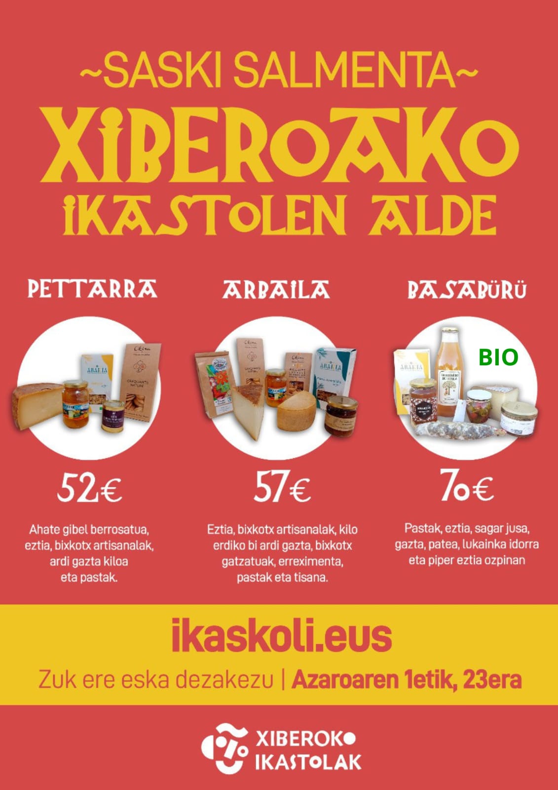 - Basabürüa (70€): Xerriki patea, bixkotx artisanalak, ardi gazta kiloa, xahalki axoa, lukainka idorra eta pastak.