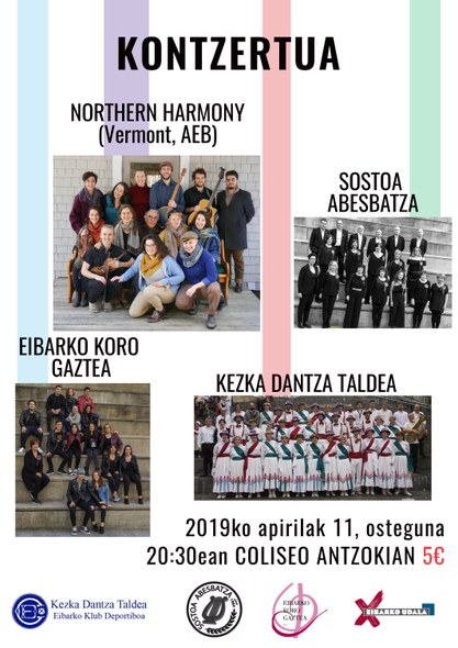 Apirilaren 11an, Vermont-eko (AEB) Northern Harmony abesbatzak emanaldia eskainiko du Eibarren, Coliseo antzokian, eta emanaldia osatuko dute Eibarko Sostoa eta Eibarko Koro Gaztea abesbatzek, eta Kezka dantza taldeak. Munduko txoko desberdinetako kantak jorratzen ditu Northern Harmonyk.