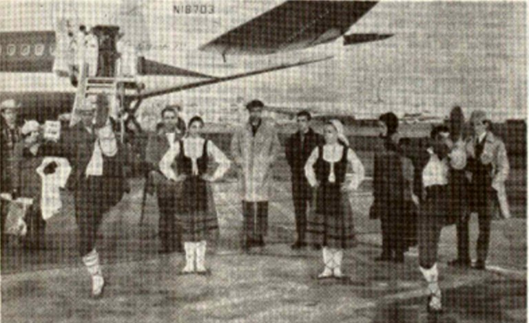 "Bilbo-ko Olaeta ballet-taldea bere San Anton-go txokora biurtu da iru illabete Ameriketa-aldean ibili ondoren. Ipar Ameriketako Estatu Batu ta Kanada-ko uriburu guzitan dantzatu dute ta gure Euskalerriko dantzak berak bakarrik dakiten bezin ederki erakutsi. Orra egazkiñetik jaixterakon nolako liraitasuna agertarazten duten Barajas-ko egazkin Zelaian".